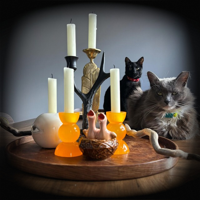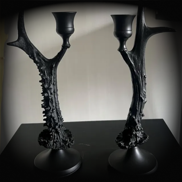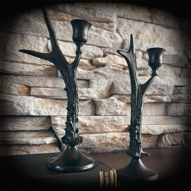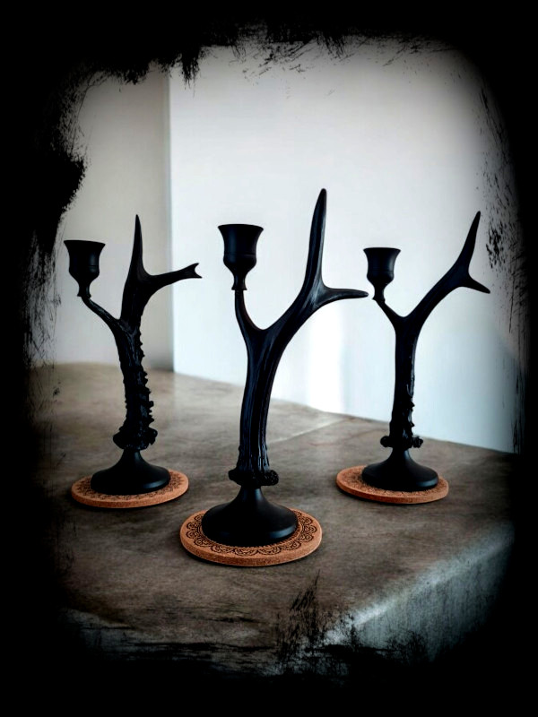Candlesticks shaped from the dark woods of the deer, carrying the light like an ancient breath. Each curve whispers the wild trace, each flame finds refuge there.
