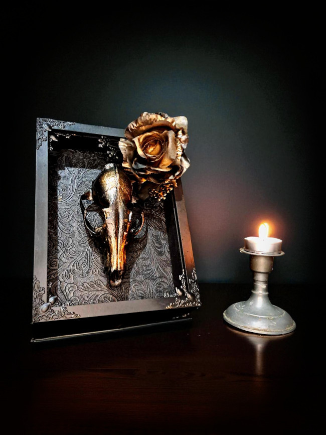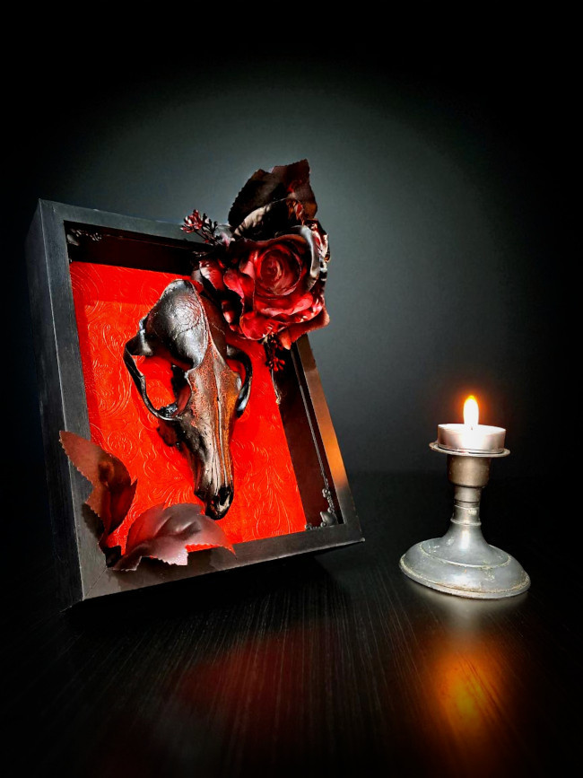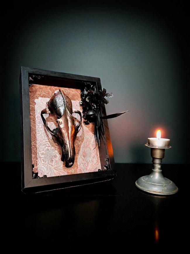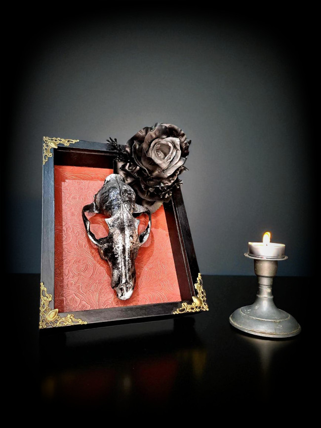 Crรขne de renard prรฉsentรฉ dans une shadow box gothique. Une crรฉation artisanale mรชlant nature et mystรจre, parfaite pour enrichir un cabinet de curiositรฉs ou une dรฉcoration dโ€™inspiration sombre et รฉlรฉgante.