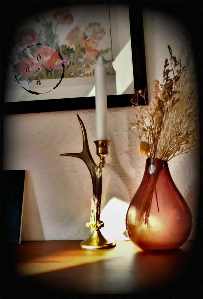 Candlesticks shaped from the dark woods of the deer, carrying the light like an ancient breath. Each curve whispers the wild trace, each flame finds refuge there.