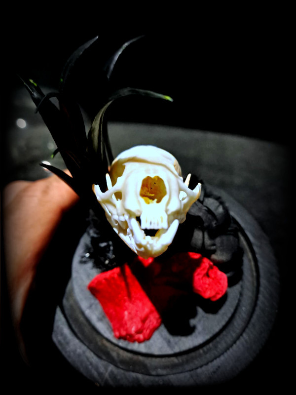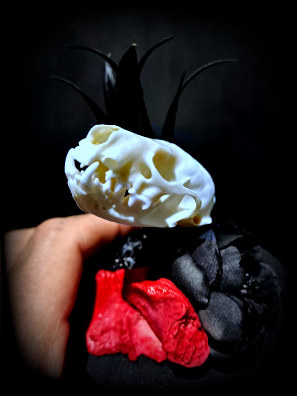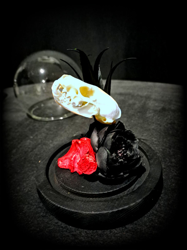 Le crâne délicat d’une martre naturelle y trône, témoin silencieux de la nature sauvage, entouré d’un décor aux contrastes puissants : une rose noire symbole de mystère et d’éternité, et un os de sanglier teinté de rouge, écho à la force brute et au sang vital.