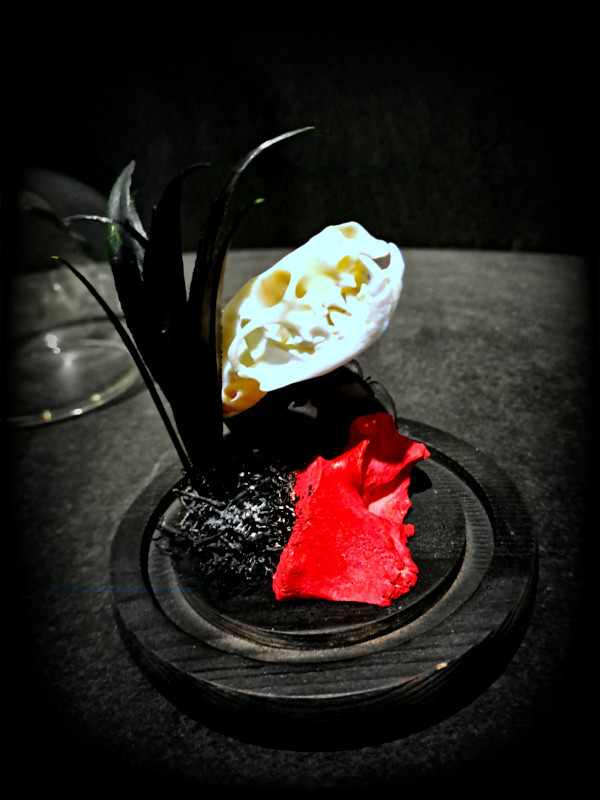 Under her glass dome, Téha captures a moment suspended between beauty and darkness. The delicate skull of a natural marten sits there, a silent witness to the wild, surrounded by a setting of striking contrasts: a black rose symbolizing mystery and eternity, and a boar’s bone tinged with red, echoing raw strength and vital blood.