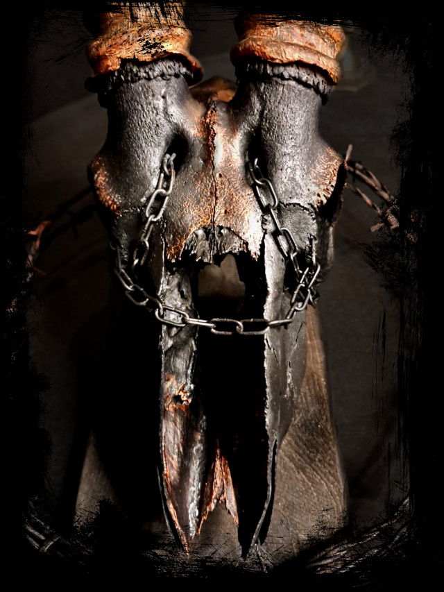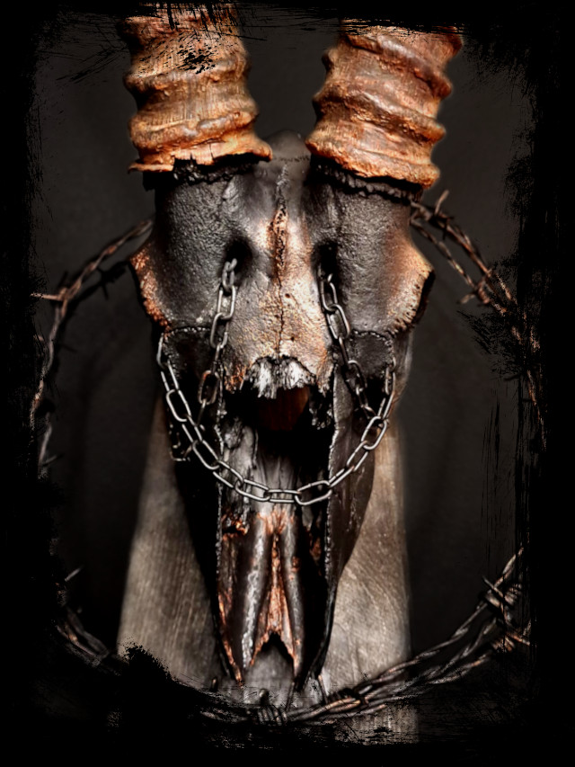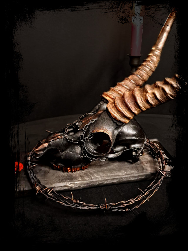The springbok skull, painted in a deep black, seems to have absorbed the whispers of time. Its horns, pointed skyward, trace a silent ascent, like an inverted prayer or a challenge to invisible powers.