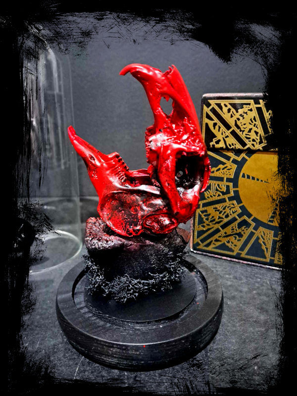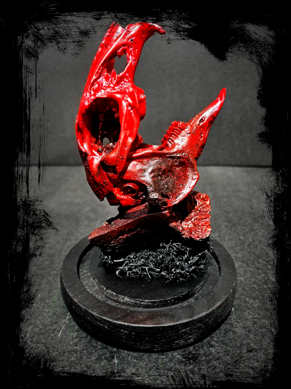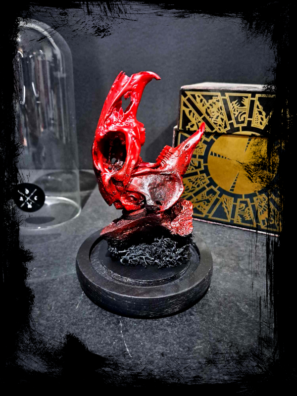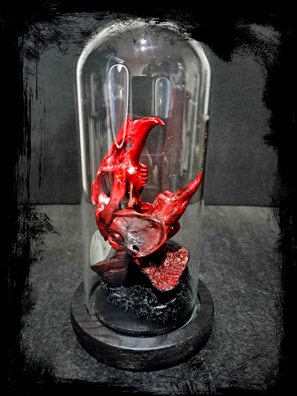 Un vรฉritable crรขne de lapin peint ร  la main dโ€™un rouge profond, prรฉsentรฉ sous cloche de verre. Inspirรฉe par lโ€™univers sombre et torturรฉ du film Hellraiser et du groupe industriel Skinny Puppy, cette crรฉation explore la frontiรจre entre la vie et la souffrance, lโ€™art et la transgression.